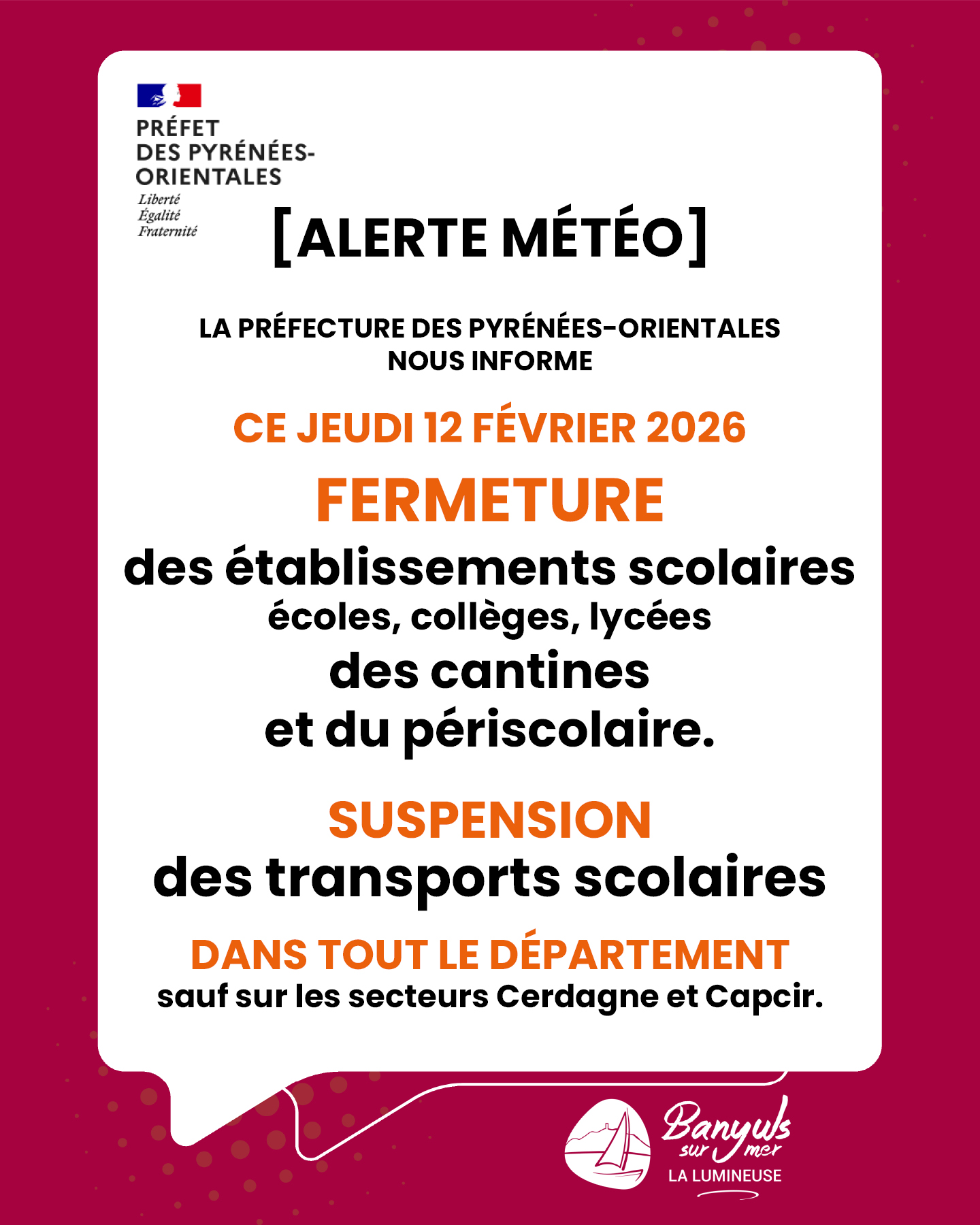 Les établissements scolaires (écoles, collèges, lycées) seront fermés et les ramassages scolaires suspendus ce jeudi 12 février dans tout le département sauf sur les secteurs Cerdagne et Capcir.